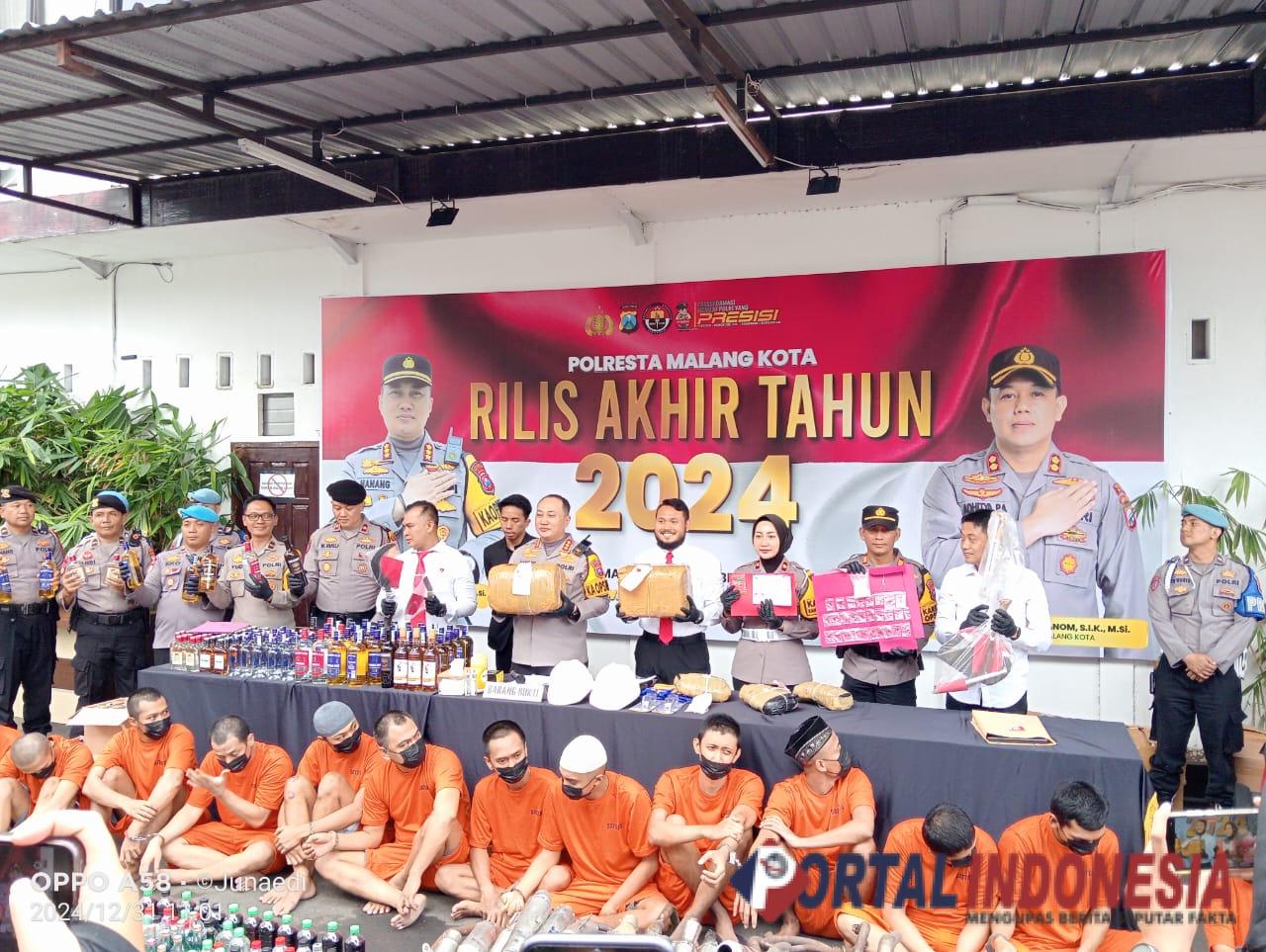 Hadir dalam acara tersebut seluruh Pejabat Utama (PJU) Polresta Malang Kota, beserta pelaku kejahatan dan barang bukti yang berhasil diamankan selama 2024.