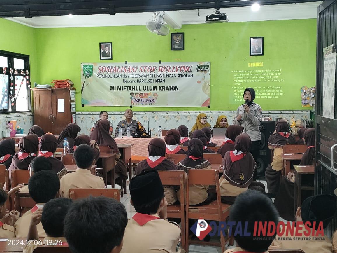 kegiatan edukasi diadakan di MI Miftahul Ulum, Desa Kraton, Krian, Sidoarjo, dengan fokus pada pencegahan perundungan (bullying) dan bahaya narkoba.