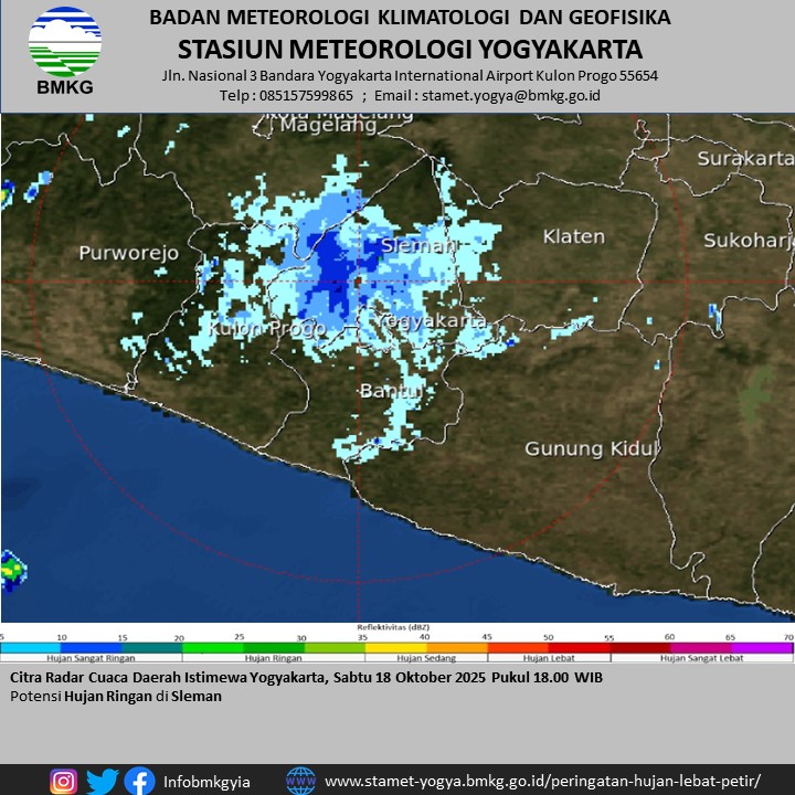 BMKG memprakirakan pada 19 Oktober 2025 terjadi hujan ringan–sedang berpotensi terjadi di Kota Yogyakarta, Sleman, Kulon Progo bagian utara, dan Gunungkidul bagian utara. Sedangkan pada 20–21 Oktober 2025 hujan sedang hingga lebat berpotensi terjadi di Kota Yogyakarta, Sleman, Kulon Progo, Bantul bagian utara, dan Gunungkidul bagian utara.