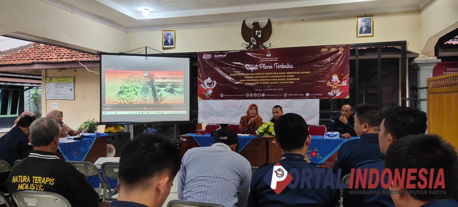 PURWOKERTO – Panitia Pemilihan Kecamatan (PPK) Purwokerto Utara, Banyumas menggelar Rapat Pleno Terbuka Rekapitulasi Daftar Pemilih Sementara Hasil Perbaikan (DPSHP) di aula Kecamatan Purwokerto Utara, Selasa sore (10/09/2024).