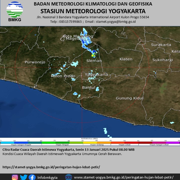 Peringatan Dini. Masyarakat, khususnya nelayan dan mereka yang berwisata di pantai untuk mewaspadai potensi hujan sedang – lebat yang dapat disertai kilat/petir dan angin kencang di Sleman bagian Utara, Kulon Progo bagian Utara, dan Gunungkidul bagian Utara serta potensi gelombang tinggi di Perairan Yogyakarta.