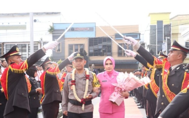 Usai rangkaian acara, AKBP Donny Lumbantoruan dihantarkan dengan prosesi pedang pora. Suasana haru mewarnai momen perpisahan saat dirinya menyalami satu per satu anggota yang melepas kepergiannya.