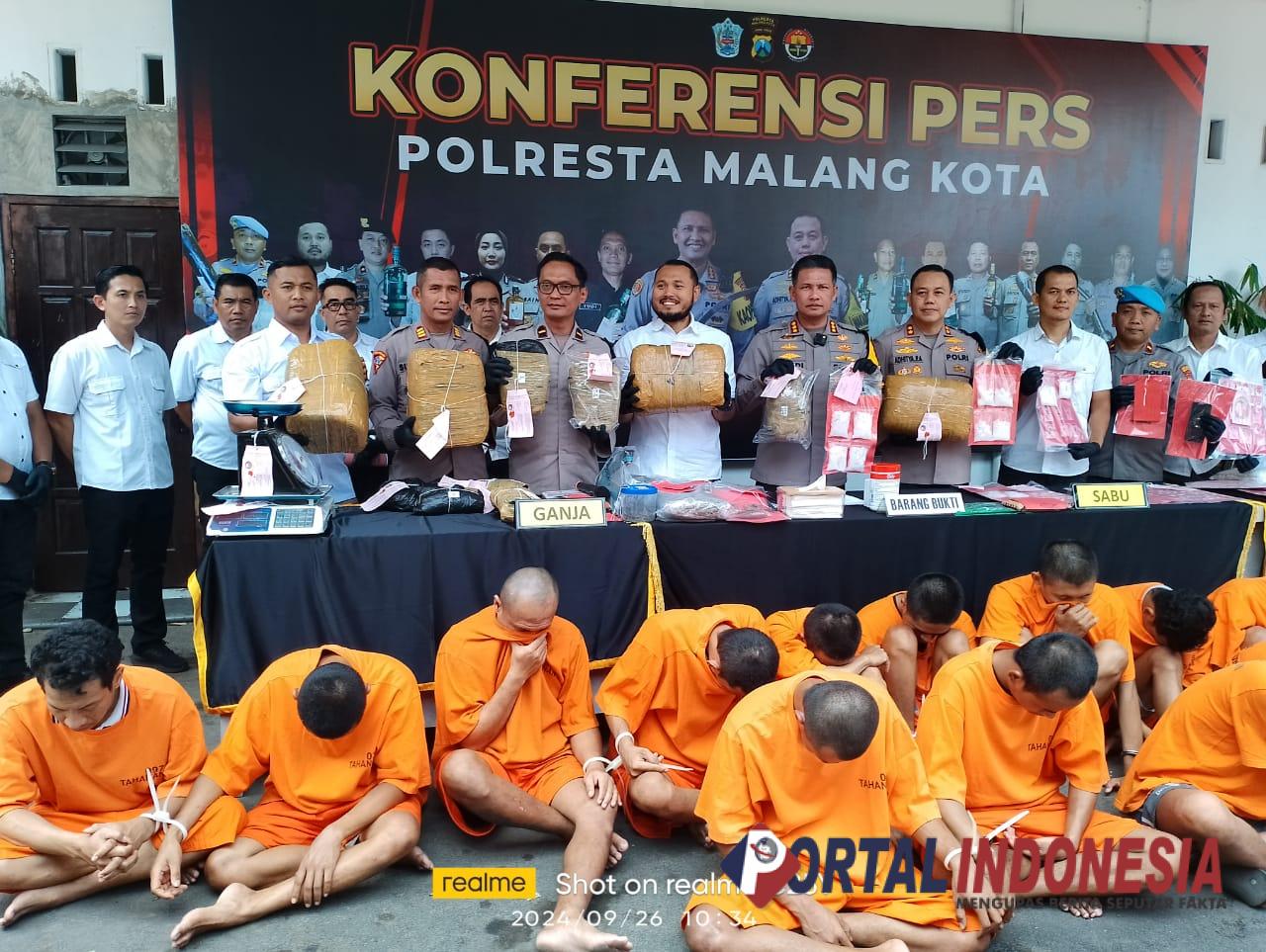Dalam konferensi pers yang dipimpin langsung oleh Kapolresta Malang Kota Kombes. Pol. Budi Hermanto, S.I.K, M.Si dan juga diikuti oleh seluruh jajaran Satreskoba tersebut juga menghadirkan sebanyak 17 tersangka dan barang bukti puluhan kilo gram Narkoba dari berbagai jenis.