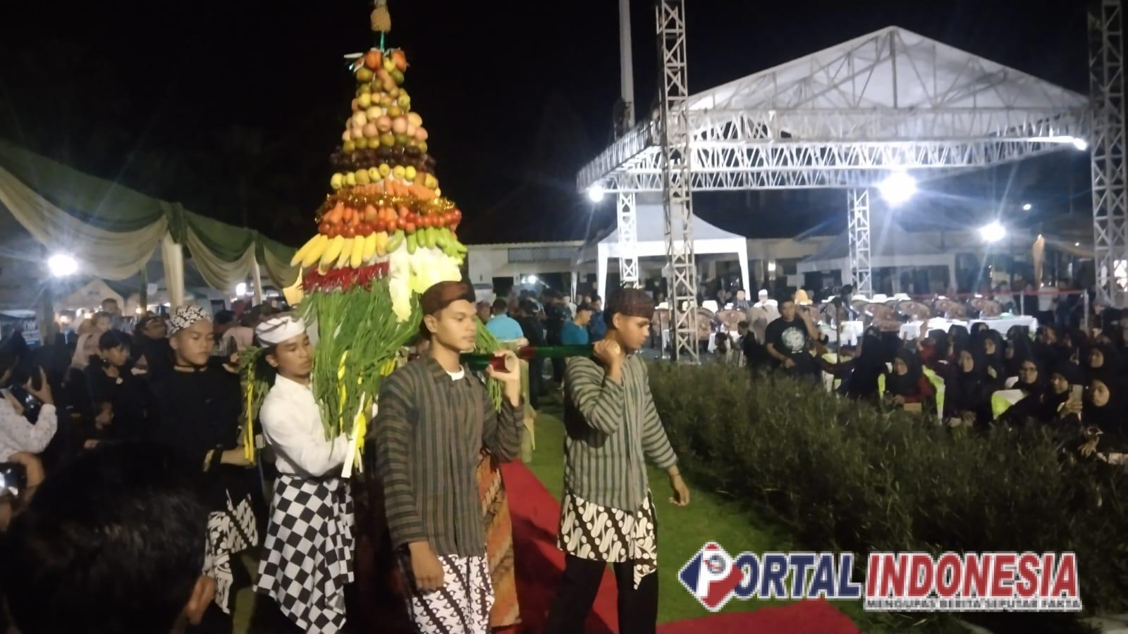 Tumpukan buah segar, sayur mayur, dan makanan tradisional disusun menyerupai gunung dan diarak dengan iringan gamelan, menciptakan suasana mistis yang penuh hikmat, sebagai bentuk rasa syukur atas limpahan hasil bumi.