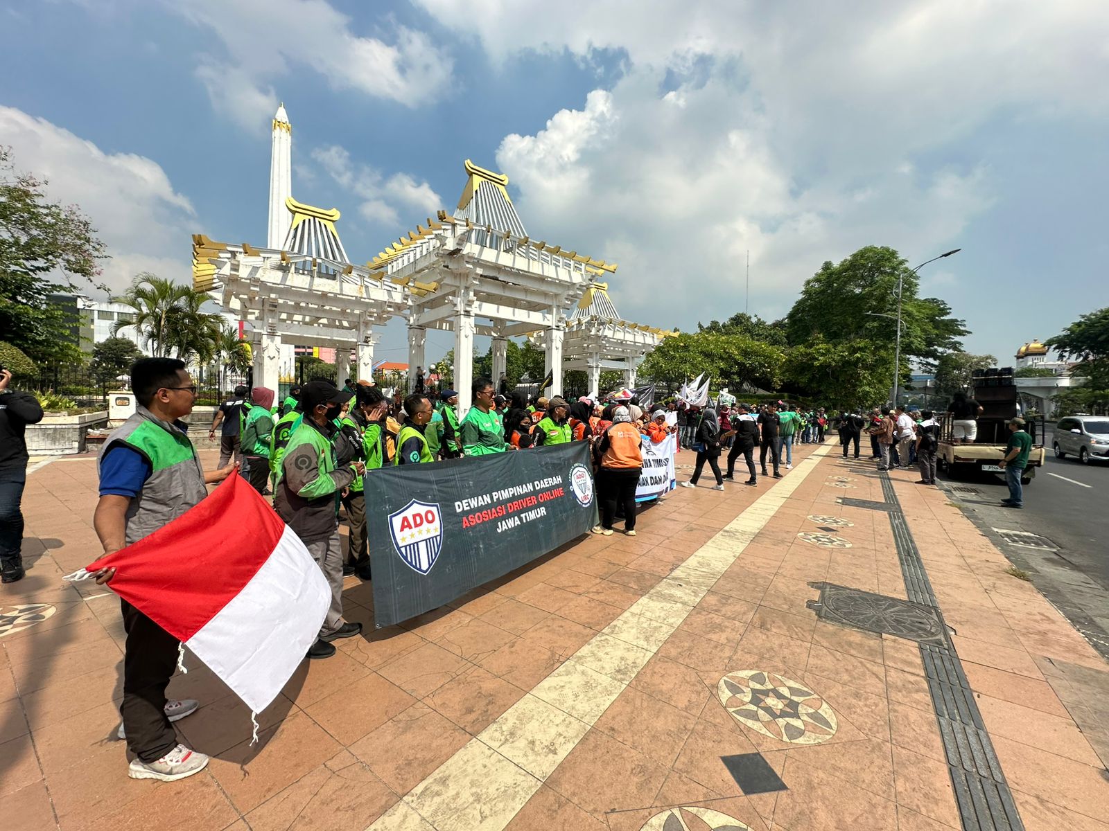 Dalam giat ini ratusan ojol memenuhi halaman Tugu Pahlawan Surabaya dengan berbagai atribut aplikator dan komunitas.