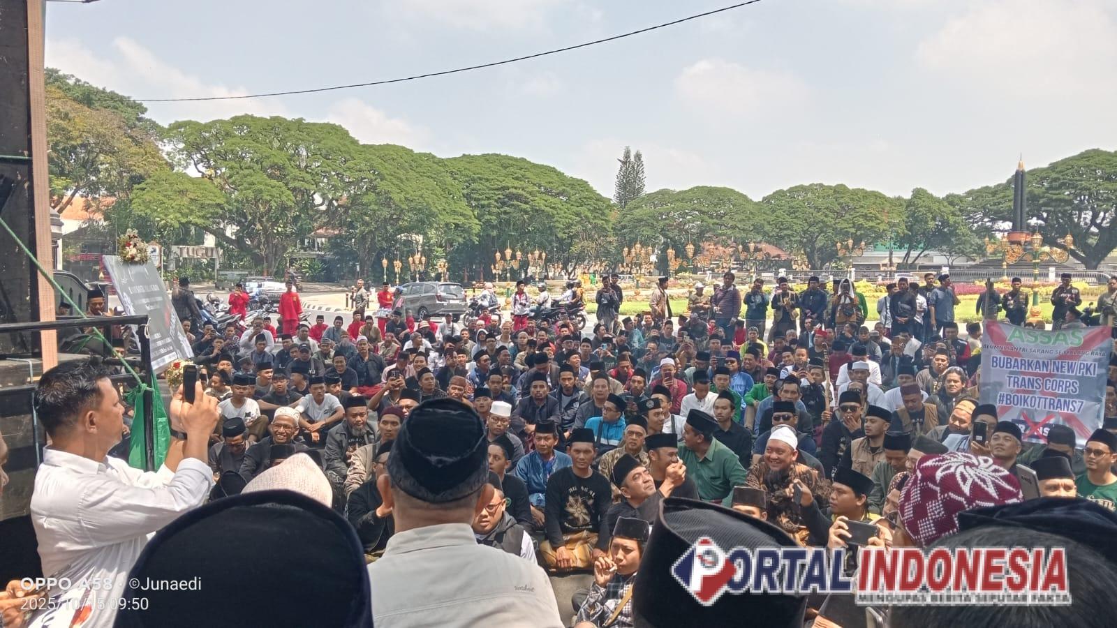 Dari pantauan portal-indonesia.net di lokasi, para peserta aksi datang dengan membawa berbagai spanduk dan poster bertuliskan pesan protes seperti “Menolak, Mengutuk, Mengecam Keras Hina Kiai dan Ponpes — #BoikotTrans7”. Sebuah mobil pikap dilengkapi pengeras suara digunakan sebagai panggung orasi, yang silih berganti diisi oleh perwakilan santri dan alumni pondok pesantren.