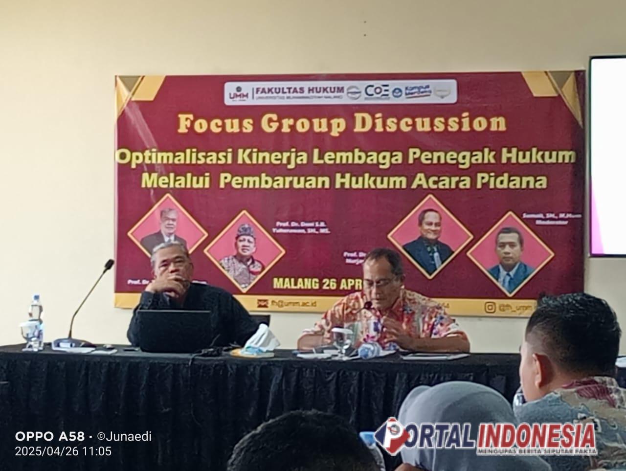 KOTA MALANG – Fakultas Hukum Universitas Muhammadiyah Malang (UMM) menggelar Focus Group Discussion (FGD) bertajuk “Optimalisasi Kinerja Lembaga Penegak Hukum Melalui Pembaharuan Hukum Acara Pidana”, menghadirkan Prof. Dr. Tongat, S.H., M.Hum sebagai narasumber utama. Kegiatan akademik ini digelar di lantai 8 Gedung GKB IV Universitas Muhammadiyah Malang dan dihadiri berbagai elemen akademisi serta praktisi hukum, Sabtu (26/04/2025).