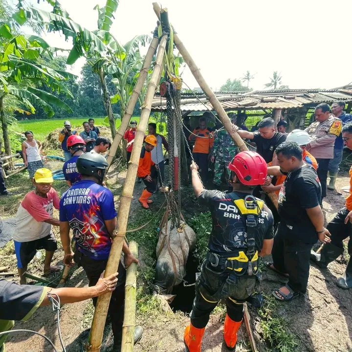 “Sapi tersebut masuk ke dalam sumur sekitar pukul 05.00 WIB dilaporkan ke kami sekitar pukul 05.30 WIB. Mendapati laporan tersebut kami dari Regu 1 Pos Damkar Kembaran, Rescue Regu 2 dan 3 Damkar Induk, dibantu dengan FPRB, KSB Sumbang, Polsek Kembaran, Koramil Kembaran, IOF Rescue, FKDM Kecamatan Kembaran, Linmas Desa Bojongsari dan warga sekitar langsung berusaha mengevakuasi sapi tersebut,” ujar dia.