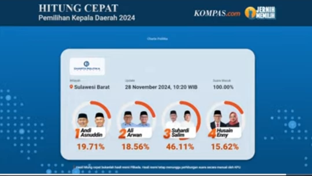 MAMUJU, – Hasil quick count atau hitung cepat Pilkada 2024 mulai dirilis lembaga survei setelah pemungutan suara Kompas.com, Jumat (29/11/2024). hitung cepat di Pilkada Sulawesi Barat SDK-JSM masih unggul.