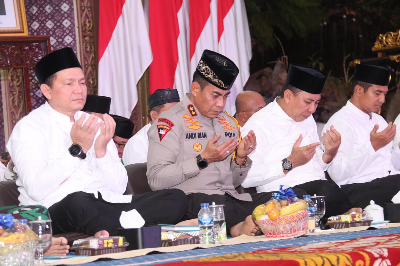 PALEMBANG — Kapolda Sumsel Irjen Pol Andi Rian R Djajadi,SIK,MH bersama Forum Koordinasi Pimpinan Daerah (Forkopimda) Provinsi Sumsel, menggelar dzikir dan doa bersama di Griya Agung jalan Demang lebar daun Palembang sebelum pemantauan malam pergantian tahun baru 2025 dan Vicon bersama Kapolri bertempat di Bundaran Air Mancur Palembang Selasa (31/12/2024).