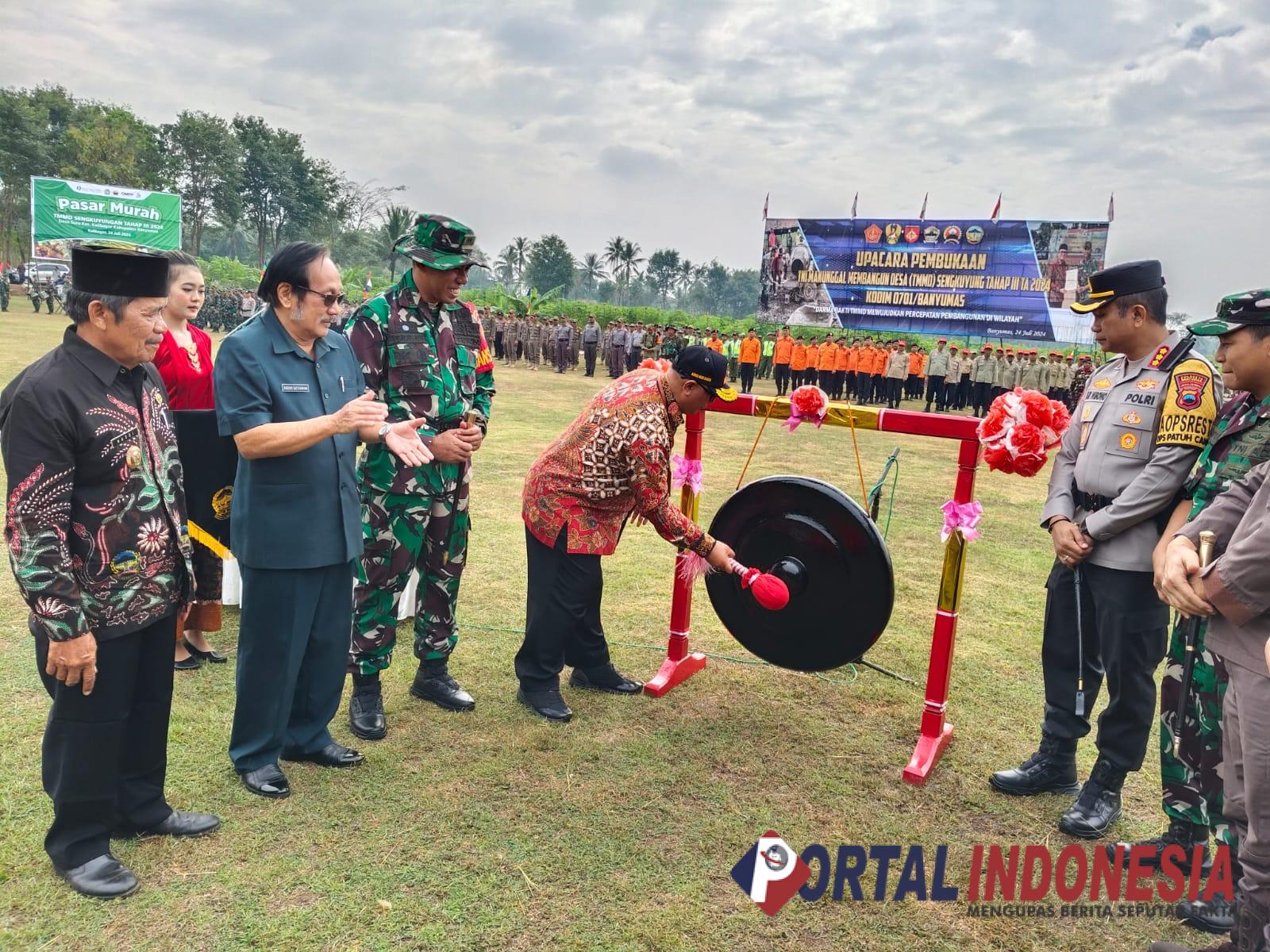 Sekda Banyumas Agus Nur Hadie pukul gong tanda dimulainya TMMD Sengkuyung Tahap III Tahun 2024.di Desa Suro. (Portal Indonesia/Gito)