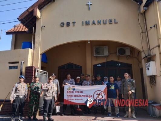 Di kedua tempat ibadah tersebut, personel TNI, Polri dan perangkat desa tampak kompak bersama warga membersihkan lantai, kaca hingga perabotan di masjid dan gereja. Selain itu, pada kesempatan ini diberikan bantuan alat-alat kebersihan pada pengurus Masjid Nurul Huda dan Gereja GBT Imanuel.