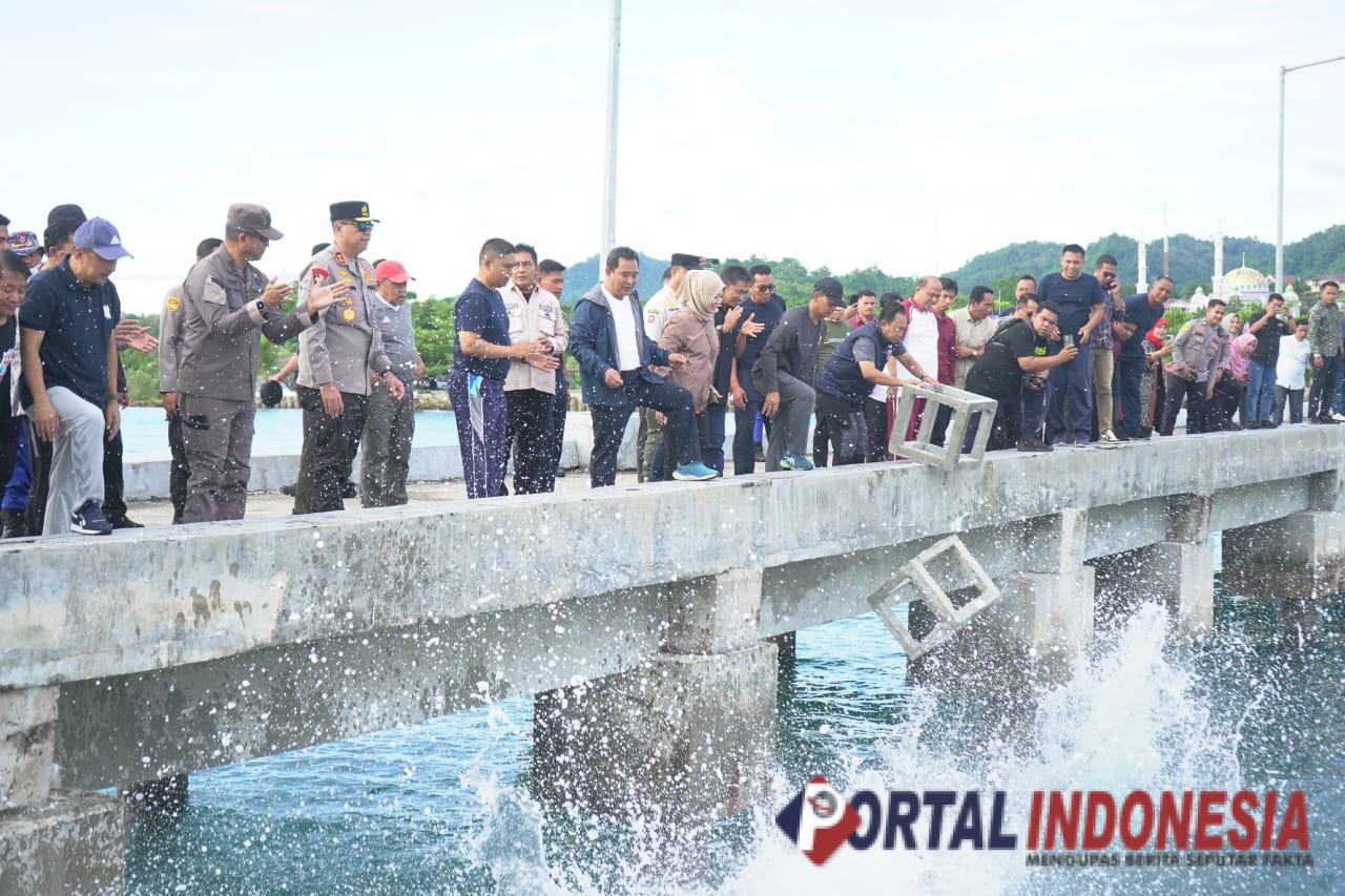 MAMUJU – Penjabat Gubernur Sulawesi Barat, Bahtiar Baharuddin, bersama Forkopimda Sulbar, melakukan aksi konservasi lingkungan dengan menurunkan seribu media karang buatan di perairan Teluk Mamuju, Kamis (16/1/2025).