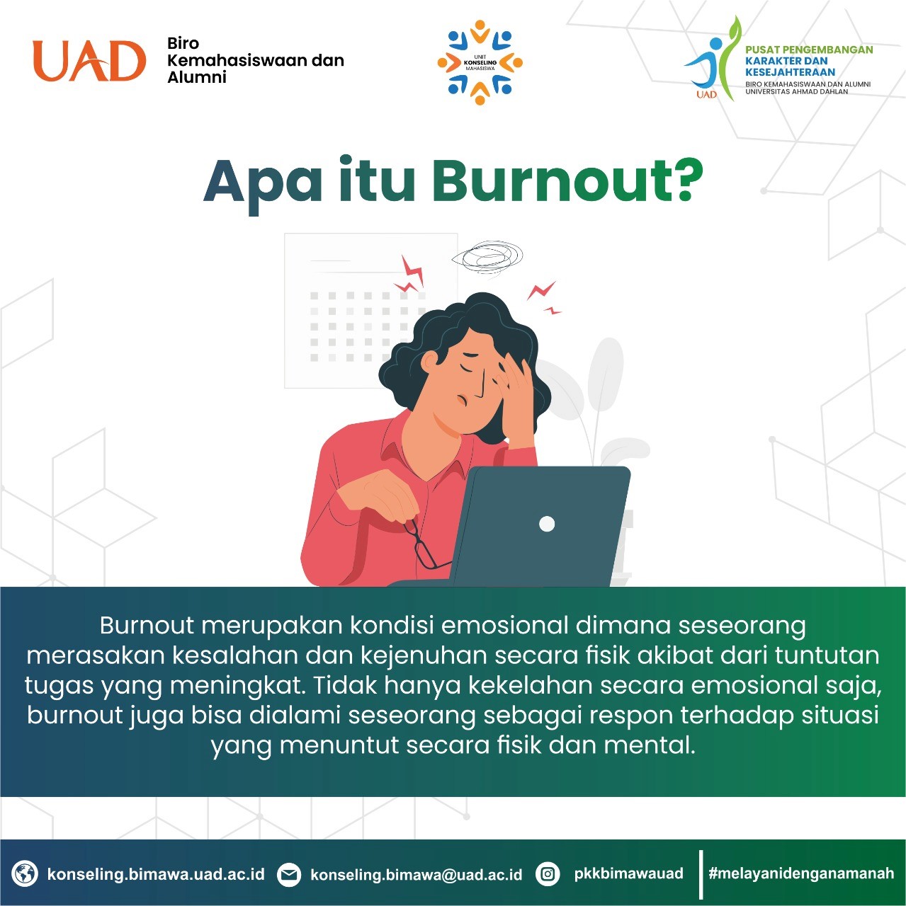 YOGYAKARTA – Burnout atau kondisi psikologis yang muncul karena stres berkepanjangan akibat dari kelelahan emosional terhadap suatu pekerjaan ataupun studi kerap menerpa generasi saat ini.