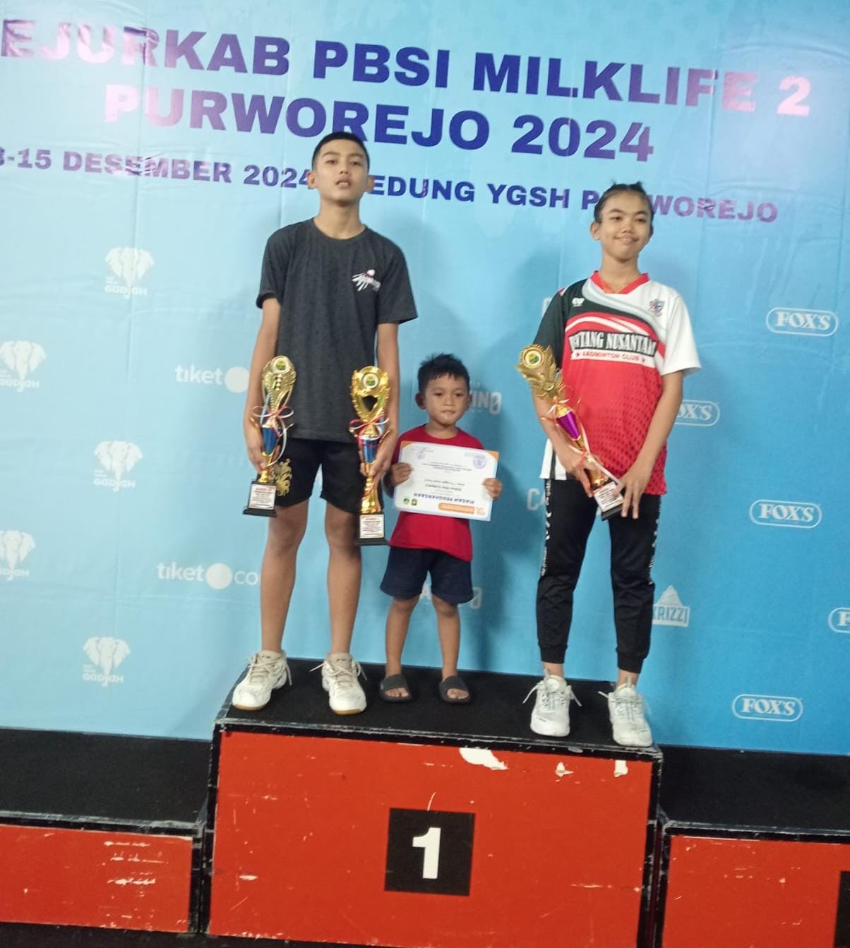 Kejurkab PBSI MILKLIFE yang digelar di gedung YGSH Purworejo dari mulai tanggal 13 sampai tanggal 15 Desember 2024 tersebut melahirkan atlet bulu tangkis yang berasal dari SMPN1 Purworejo kelas7 yaitu yang bernama Raihan Dhio Syahputra dan Candi Proboningrum Galih Kusuma,15/12/2024.