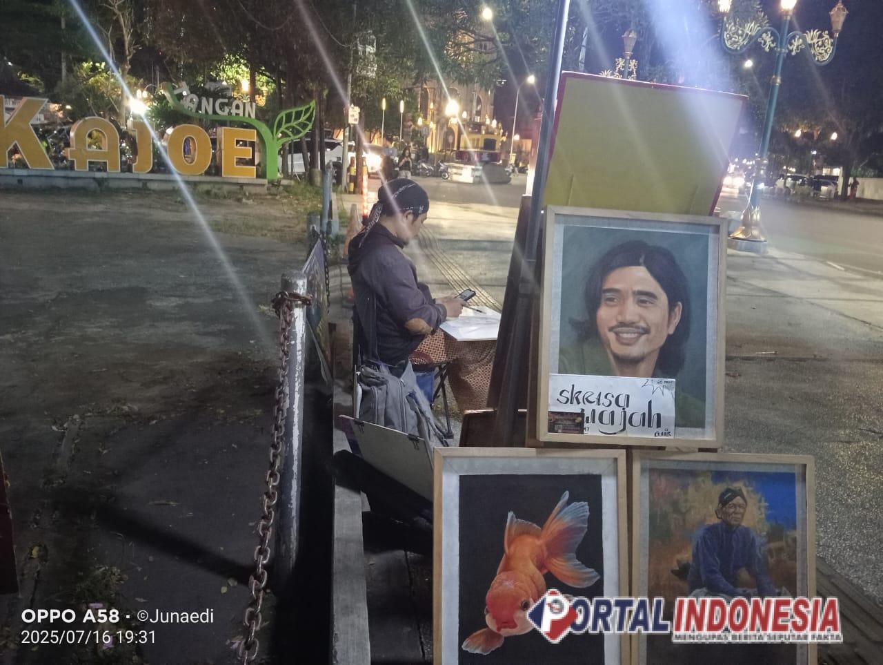 KOTA MALANG – Gemerlap wisata malam di kawasan Kayutangan Heritage, Kota Malang, tak hanya diramaikan oleh Pedagang Kaki Lima (PKL) yang menjajakan aneka kuliner dan barang unik. Di antara lalu-lalang pengunjung, tampak sosok seniman jalanan yang mencoba mengais rezeki lewat sapuan pensil di atas kertas. Rabu (18/07/2025), Wariaji, warga Kecamatan Dau, Kabupaten Malang, hadir dengan keahlian melukis sketsa wajah.