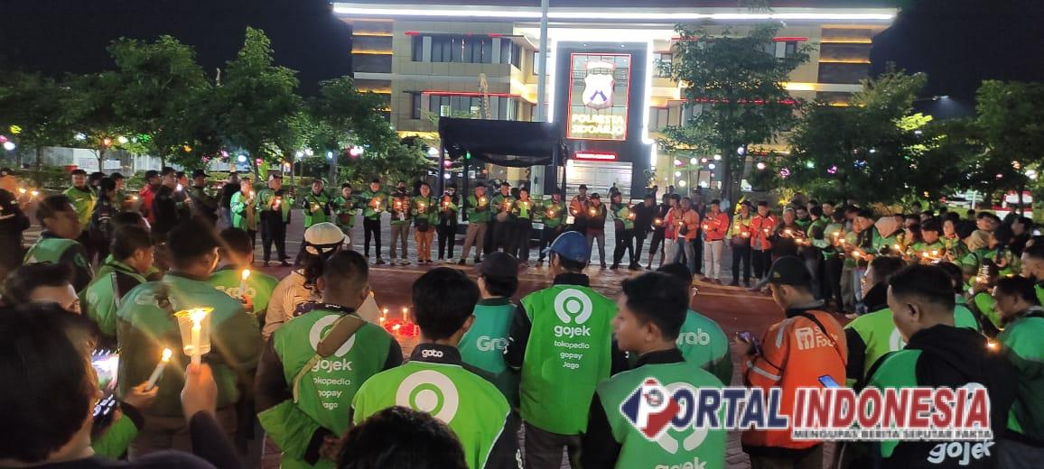 SIDOARJO – Ratusan pengemudi ojek online (ojol) bersama jajaran kepolisian Polresta Sidoarjo menggelar aksi solidaritas penuh haru atas wafatnya salah satu rekan mereka, Affan Kurniawan, Jumat (29/8/2025) malam.