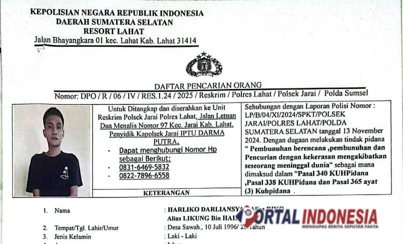 Tersangka diketahui bernama Harliko Darliansyah alias Riko alias Likung, pria 28 tahun asal Desa Sawah, Kecamatan Muara Pinang, Kabupaten Empat Lawang, yang tengah menjalani proses hukum atas dugaan pembunuhan berencana dan pencurian dengan kekerasan yang menyebabkan korban meninggal dunia.