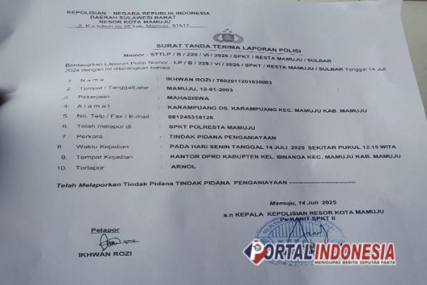 Berdasarkan dokumen yang diterima redaksi, laporan itu teregistrasi dengan Nomor: LP/B/228/VI/2025/SPKT/RESTA MAMUJU/SULBAR, tertanggal 14 Juli 2025.