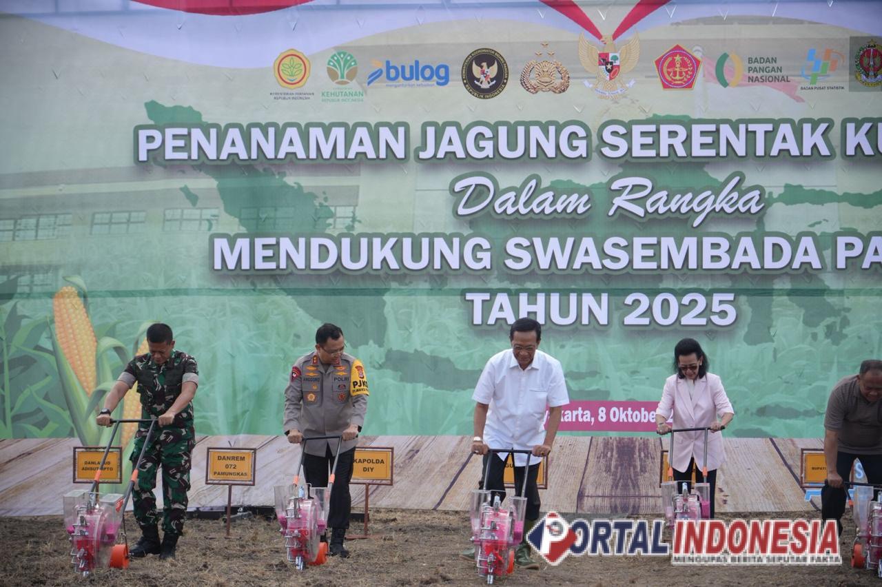 YOGYAKARTA – Dalam rangka mendukung program Swasembada Pangan Tahun 2025, Polda DIY melaksanakan Penanaman Jagung secara serentak kuartal IV, di lahan Sultan Ground, Padukuhan Pirakbulus, Kalurahan Sidomulyo, Kapanewon Godean, Kabupaten Sleman, Rabu (8/10/2025).