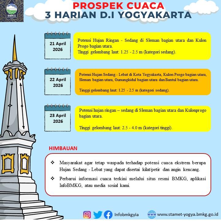 YOGYAKARTA – Badan Meteorologi, Klimatologi, dan Geofisika (BMKG) Stasiun Meteorologi Yogyakarta mengeluarkan peringatan dini terkait prospek cuaca di wilayah D.I. Yogyakarta untuk periode 21 hingga 23 April 2026. Masyarakat diimbau waspada terhadap potensi hujan lebat yang dapat disertai kilat dan angin kencang di sejumlah titik.