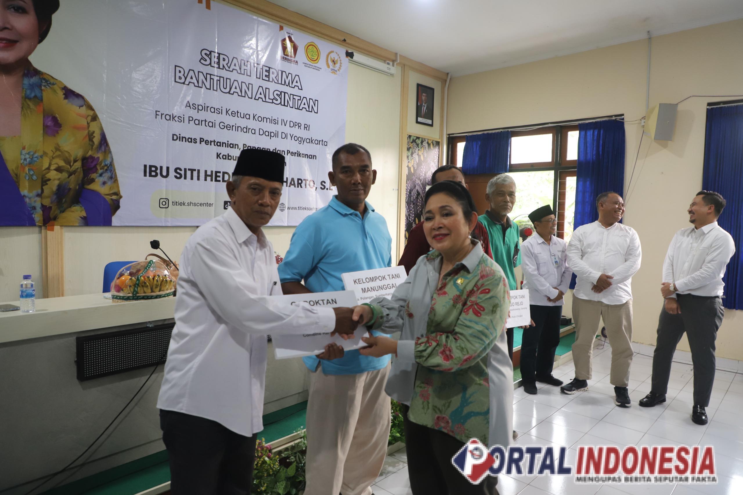 SLEMAN – Ketua Komisi IV DPR RI, Siti Hediati Soeharto, atau yang akrab disapa Titiek Soeharto menyerahkan bantuan alat mesin pertanian bagi para petani Kabupaten Sleman, Rabu (4/6/2025).