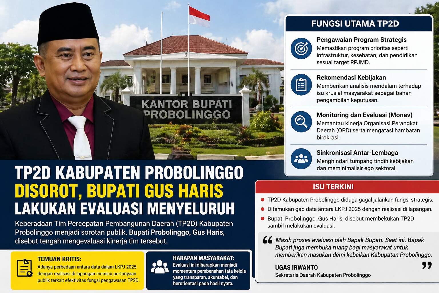 PROBOLINGGO – Keberadaan Tim Percepatan Pembangunan Daerah (TP2D) Kabupaten Probolinggo menjadi sorotan publik. Sejumlah kalangan menilai tim tersebut belum optimal menjalankan fungsi strategisnya sebagai pendukung percepatan program pemerintah daerah.