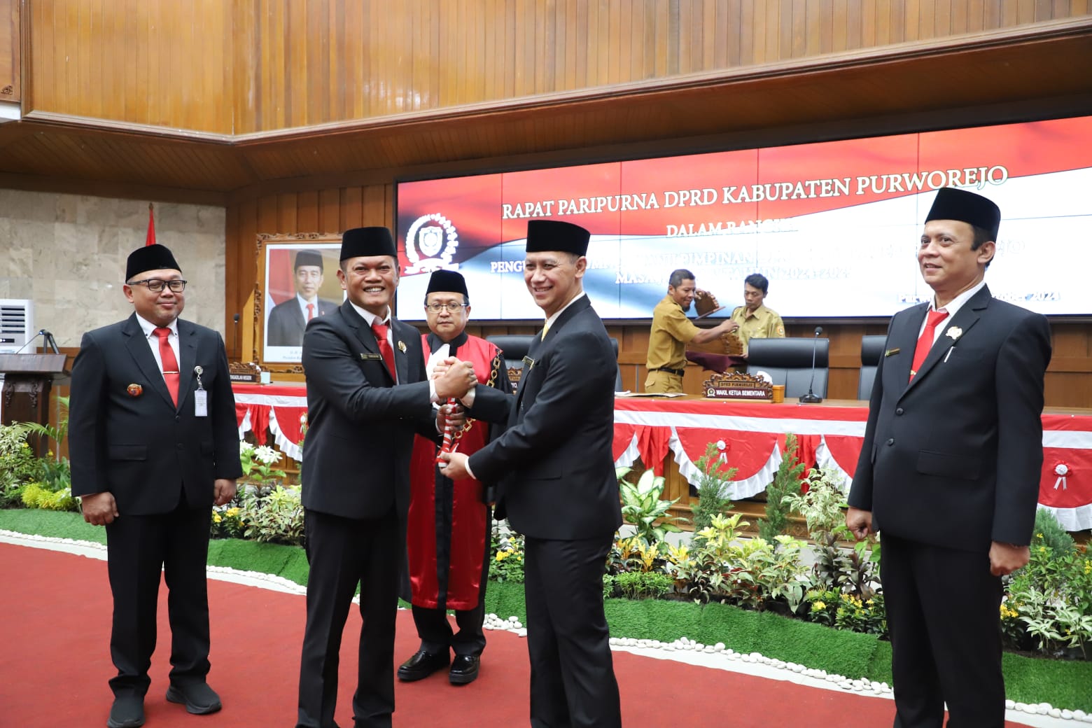Ketiganya mengucap sumpah/janji sebagai Pimpinan DPRD Kabupaten Purworejo, dalam Rapat Paripurna di gedung DPRD setempat, Selasa (15/10/2024). Sebelumnya, Pjs Bupati Purworejo Endi Faiz Efendi SPi MA menerima berita acara usulan pimpinan DPRD definitif dari Ketua DPRD sementara Rochman SSos.
