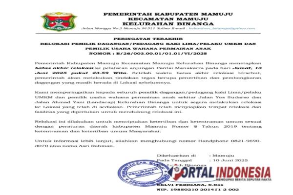 MAMUJU – Pemerintah Kelurahan Binanga bersikap tegas. Pelaksana Tugas (Plt) Lurah Binanga, Selvi Febriana, S.Sos, resmi mengeluarkan surat peringatan terakhir bagi para pedagang kaki lima (PKL), pelaku UMKM, dan pengusaha wahana permainan anak-anak yang masih bertahan di lokasi lama.