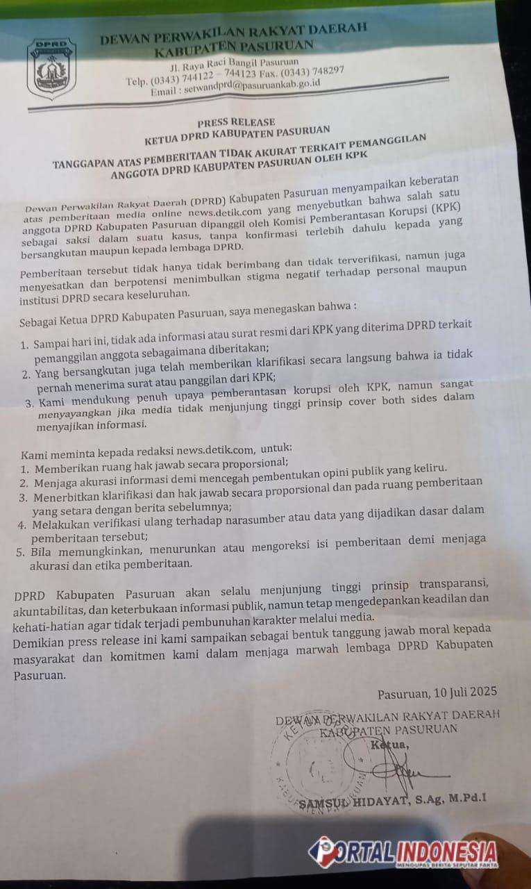 Oleh karena itu, pihak DPRD Kabupaten Pasuruan juga meminta kepada pihak perusahaan media yang dimaksud agar memberikan ruang hak jawab tidak lain demi mencegah pembentukan opini publik ditengah masyarakat.