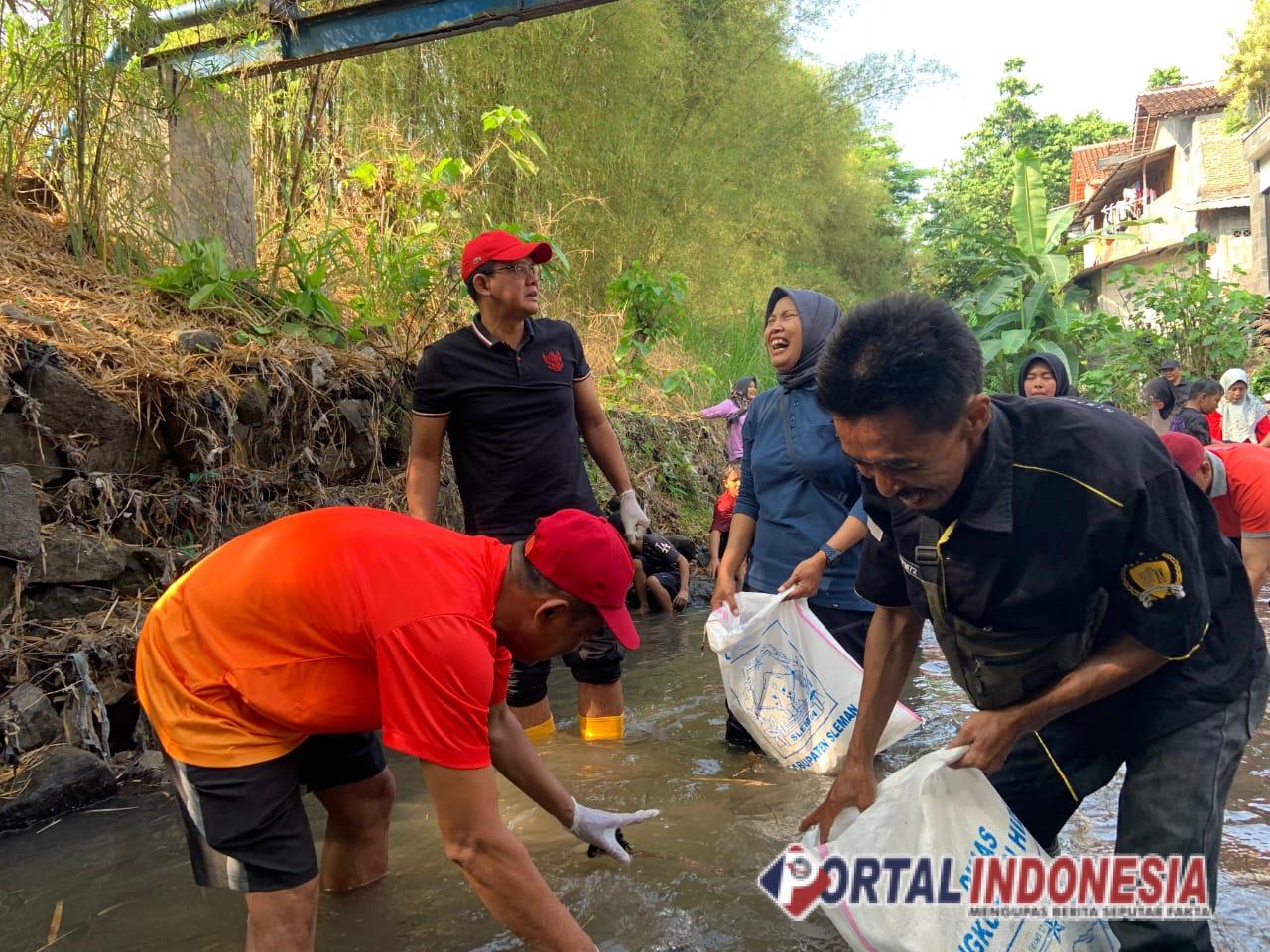 Dalam kegiatan Merti Kali Grojogan 9 Program Kali Bersih yang diselenggarakan di Padukuhan Nayan, Kalurahan Maguwoharjo, Kecamatan Depok, Sleman Sabtu (31/8/2025) Danang Maharsa ikut terjun ke sungai bersama warga untuk membersihkan sungai.