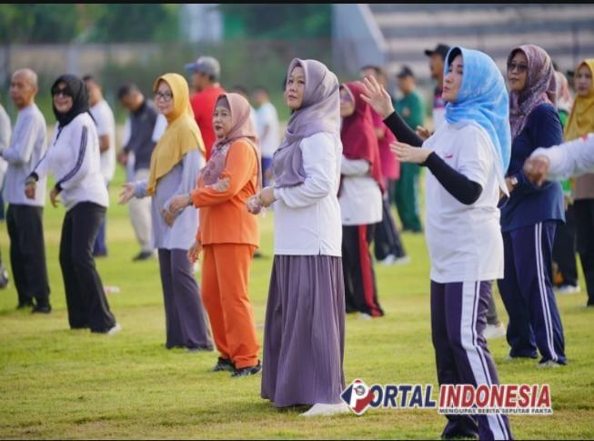 Foto momen senam bersama di Stadion Bayuangga dengan latar peserta yang antusias