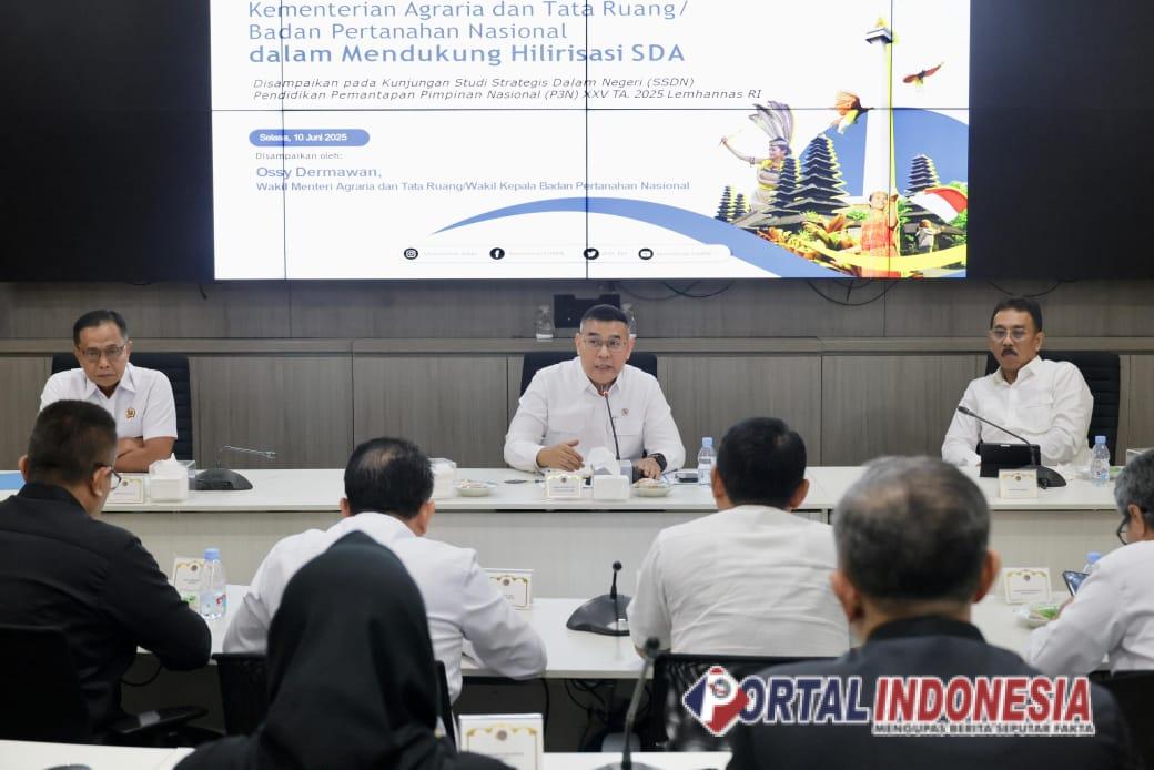 JAKARTA – Wakil Menteri Agraria dan Tata Ruang/Wakil Kepala Badan Pertanahan Nasional (Wamen ATR/Waka BPN), Ossy Dermawan, menegaskan bahwa hilirisasi industri tidak bisa terwujud tanpa fondasi agraria yang kuat. Hal ini disampaikan saat menerima kunjungan peserta Studi Strategis Dalam Negeri (SSDN) Pendidikan Pemantapan Pimpinan Nasional (P3N) XXV Tahun 2025 dari Lemhannas RI, Selasa (10/06/2025).