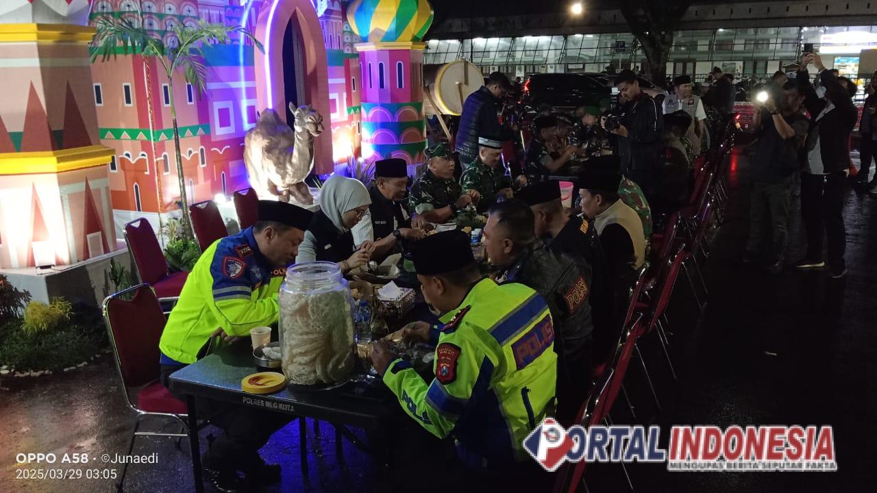KOTA MALANG – Dalam upaya menjaga kondusifitas wilayah menjelang Idul Fitri 1446 H, Wali Kota Malang Wahyu Hidayat bersama Forkopimda Kota Malang menggelar sahur bersama di depan Pos Pelayanan (Posyan) Polresta Malang Kota, Stasiun Kota Baru, Sabtu (29/03/2025).